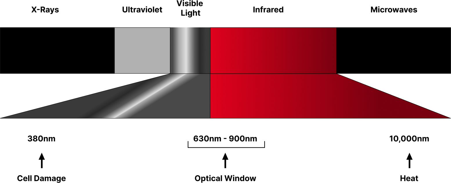 Water has very high absorption for light at wavelengths longer than 1500 nm, and since water is the major constituent of muscle tissue, this radiation does not penetrate significantly below the skin. We thus are left with an optimum treatment window which is the optical window, between approximately 600 nm to 900 nm where the radiation does not cause ionization and can penetrate beneath the skin to affect the underlying tissue.